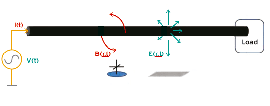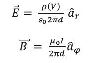 Coulomb’s and Biot-Savart Laws, respectively, relate the electric and magnetic fields to the voltage V and current I on a single straight energized wire (See Figure 1) where μ0 and ε0 are magnetic permeability and electric permittivity constants, ρ is the surface charge density on the wire, and aφ and ar are vectors pointing in the direction of the field in cylindrical coordinates. Superposition principles are used with Coulomb and Biot-Savart Laws in multi-wire configurations (i.e., 3-phase power cables). The boundary element method or electromagnetic models are typically used to solve for ρ(V), which changes minimally along the length of the wire at quasi-static frequencies.
