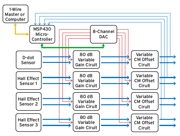 - Output signal is measured by microcontroller’s analog-to-digital converters (ADCs) (thin blue).