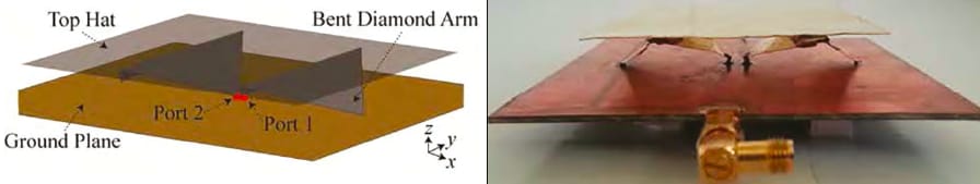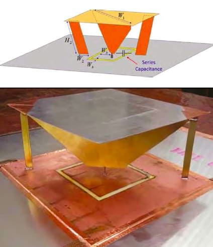 To overcome this limitation and extend the bandwidth of the antenna, we proposed a new design of a wideband antenna that takes advantage of the previous antenna in a dual-antenna system. This significantly enhances the bandwidth over which the antenna can maintain its omnidirectionality. The topology and the photograph of a fabricated prototype of this modified antenna is shown in Figure 2. We demonstrated experimentally that this antenna can cover up to a decade of bandwidth with consistent, vertically polarized, omnidirectional patterns across the entire band. At its lowest frequency of operation, this antenna has electrical dimensions of 0.026 λmin × 0.026 λmin × 0.046 λmin, where min is the wavelength at the lowest frequency of operation.