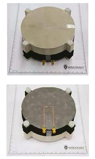 The MEFSSs were also integrated with low-profile, linearly and circularly polarized antennas. Figure 5 shows a photograph of the linearly polarized antenna integrated with the MEFSS. The antenna radiates similar to a vertically polarized monopole, but is completely flush-mounted. The antenna also has omnidirectional radiation patterns in the azimuth plane. The antenna is cavity-backed and the frequency selective surface is completely integrated with the antenna within the cavity. The FSS is designed to be transparent in the frequency range where the antenna is expected to radiate. Outside of this frequency range, it presents a metallic ground plane where the FSS shields the antenna, at frequencies where the radar cross-section of the antenna may be high.