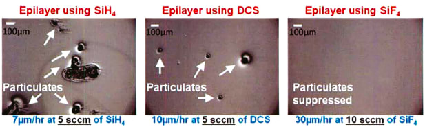 The report highlights the innovative use of halogenated precursors, specifically chlorine-based dichlorosilane (DCS) and fluorine-based tetrafluorosilane (TFS), in the chemical vapor deposition (CVD) process for epitaxial growth. Notably, TFS (SiF4) is utilized for the first time in this context, demonstrating its effectiveness in completely eliminating the formation of silicon droplets, a common issue that can degrade the quality of the epitaxial layers. This advancement allows for the suppression of parasitic deposition, thereby enabling the growth of high-quality SiC layers.