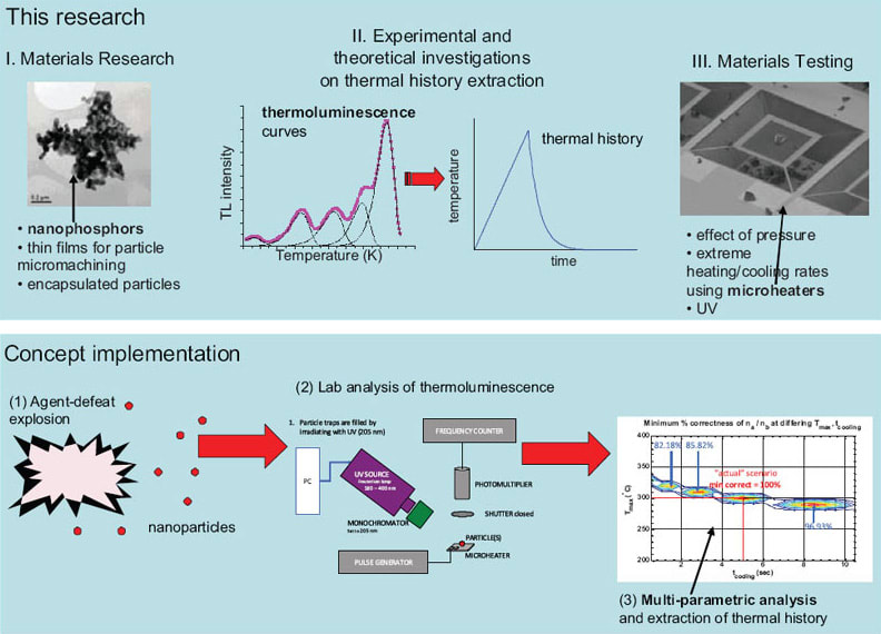The TL technique investigated in this study has the potential to record the entire temperature history during an agent-defeat test (ADT). Traditional contact (thermocouples, thermistors, etc.) and non- contact temperature measurement methods (spectroscopy, pyrometry) are not capable of determining the temperature experienced by a particle during an ADT. Other techniques under development, such as fluorescence nanoparticle probes, are also not applicable, because they rely on real-time changes in the fluorescence as a function of temperature, and therefore cannot be used in extreme environments (inside blast and fireball, or in dark, smoky blast cloud and dust plume).