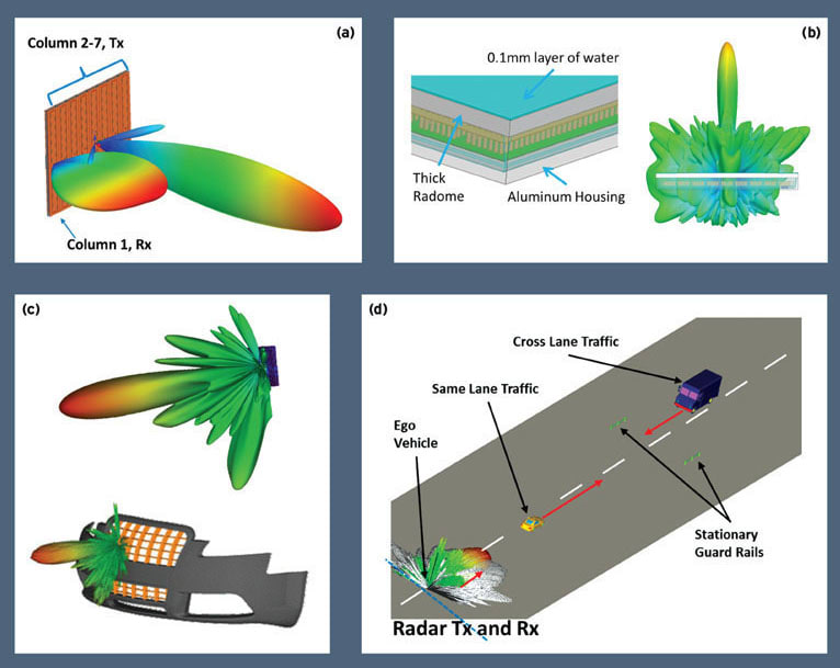 3D electromagnetic field solvers based on the Finite Element Method (FEM) and Shooting-Bouncing Rays solvers (SBR) are used for performing high-fidelity simulations of automotive radars. These simulations accelerate four radar development aspects, as follows: