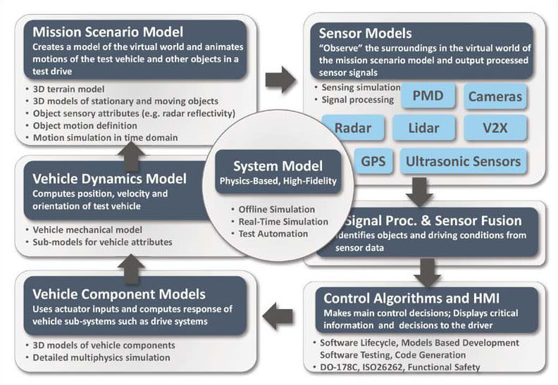 Just as in hardware development, simulation has a key role to play in software development. Developing and testing signal processing routines, sensor fusion algorithms, object recognition functions, control algorithms, and human-machine inter-face (HMI) software, with model-based software development techniques makes the software robust, less error-prone, and safe.