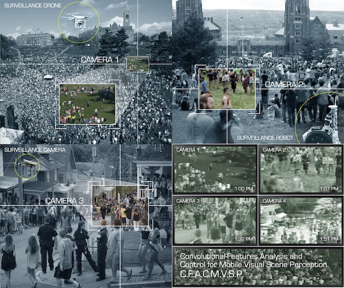 Researchers plan early tests on the Cornell campus, using research robots to “surveil” crowded areas while drawing on an overview from existing webcams. This work might lead to incorporating the new technology into campus security.
