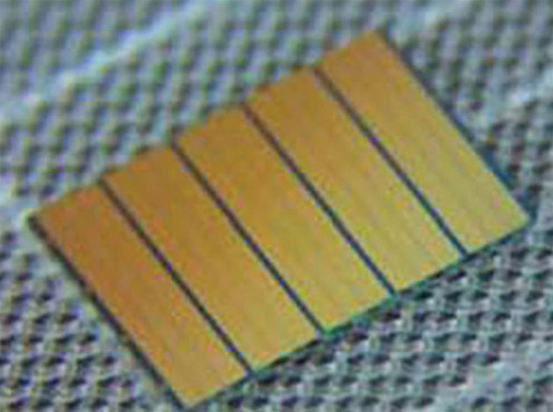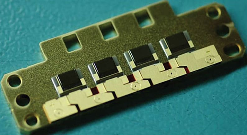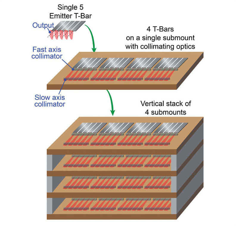 For military applications, four of these T-Bar dies are mounted on to a single substrate, yielding a total of 20 emitters. Then, up to four of these substrates are stacked vertically, bringing the total number of individual emitters in this compact assembly to 80, with a total output of about 800 W.