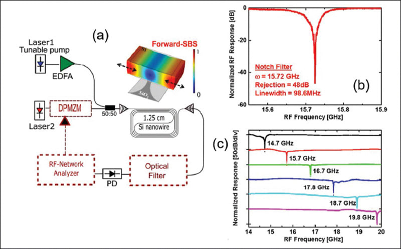 The first functional device for signal processing based on SBS from a silicon nanowire was developed that employs a novel cancellation filter technique to harness the modest SBS gain in silicon, creating a high-performance microwave photonic notch filter (Figure 1a). Only 0.98 dB of on-chip SBS gain was used to create a cancellation microwave photonic notch filter with 48 dB of suppresion, 98 MHz linewidth (Figure 1b), and 6-GHz frequency tuning (Figure 1c). This establishes the path toward monolithic integration of high-performance SBS microwave photonic filters in a CMOS-compatible platform such as SOI.