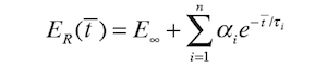 Here, ⊺ refers to reduced time, meaning the test time divided by the horizontal shift factor aT. The variable ER is the relaxation modulus, E∞ is the long-term relaxation modulus, and the n exponential terms each have a coefficient αi and an exponential constant τi. The relaxation modulus is therefore represented as a sum of a series of exponential terms, each with its own time constant, so that the entire spectrum of relaxation times and temperatures is well represented.