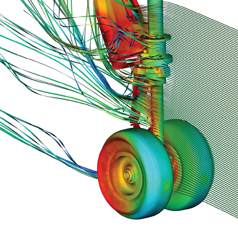 Community noise has two main sources: engine noise and airframe noise. Significant progress in reducing engine noise over the past two decades has promoted airframe noise to the most urgent challenge now. Airframe noise is caused principally by airflow around the aircraft’s landing gear, and around high-lift devices such as wing flaps and slats. Wind tunnel testing is seldom, if ever, a viable solution in commercial aircraft development programs due to cost and time constraints. But the alternative—using digital simulation to test and refine concepts for airframe noise reduction—is a challenging task. To be effective, the entire aircraft has to be simulated in order to identify the interactions among landing gear, wings and other components that are a major cause of noise. In addition, the landing gear’s complex geometry has to be represented at high fidelity in the simulation model, since even small geometry details can be significant noise contributors.