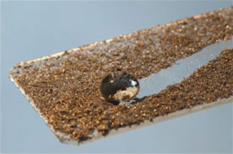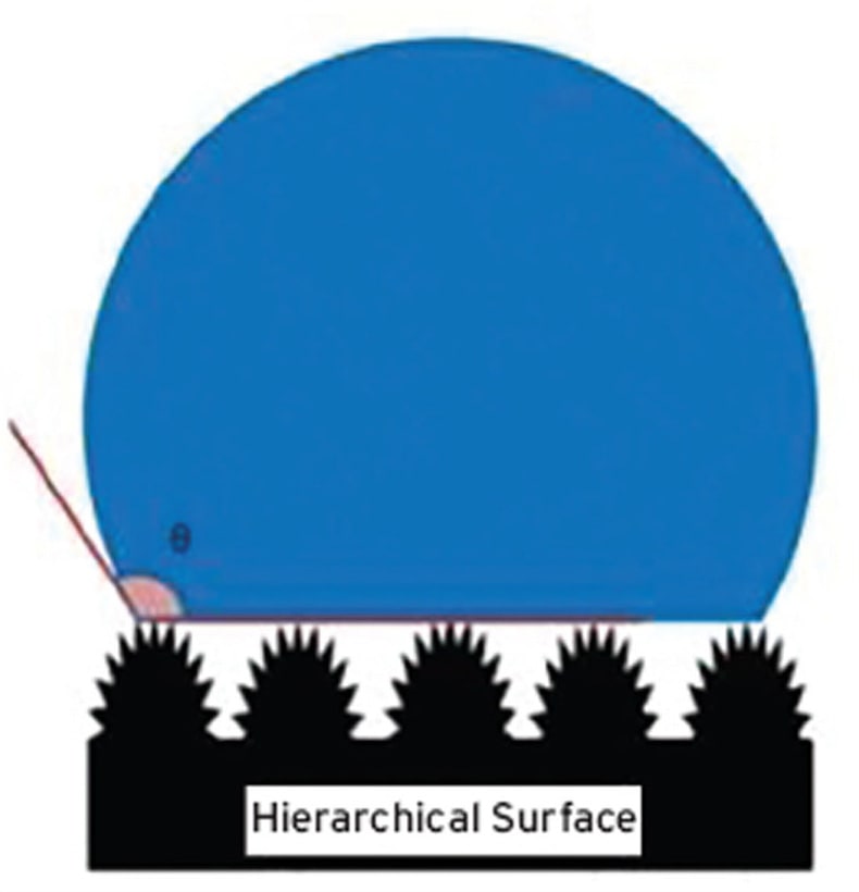 It can be seen from Figure 2, that in the Cassie state the equilibrium contact angle is a result of the proportion to the air-water interface. Revisiting the Lotus leaf effect, when the microscale peaks are combined with nanoscale features, a hierarchical structure is created and the Cassie state is improved by increasing the proportion of the air-water interface and thus increasing the equilibrium contact angle, thereby creating a surface that is near perfectly superhydrophobic, as seen in Figure 3. It is this air-water interface that is of particular interest to researchers and engineers, because of the potential to change fluid-surface interaction by the addition of an air film separation between the surface and the water, therefore altering the hydrodynamic properties.