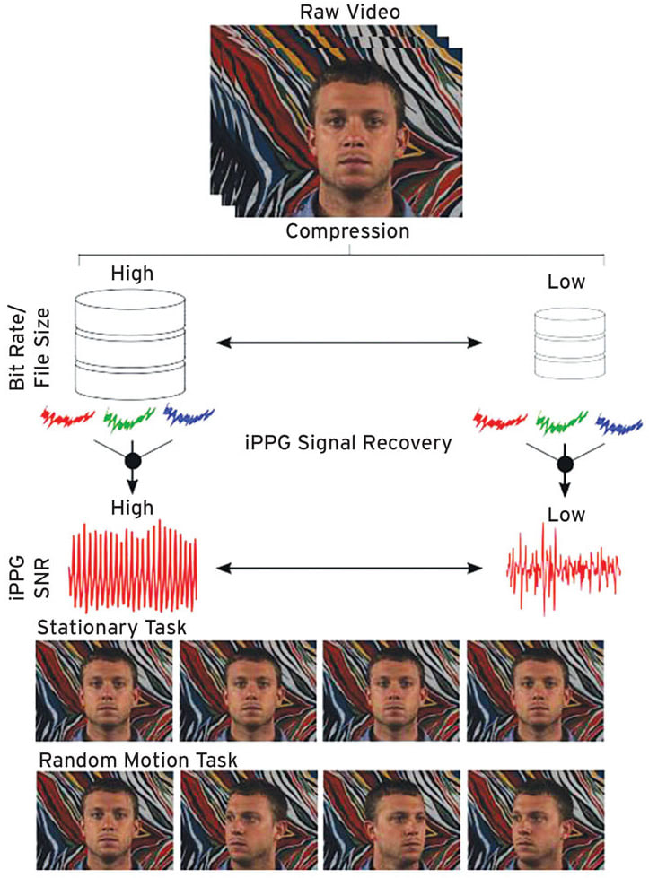 A number of parameters influence the accuracy of iPPG measurements. These include the imager quality, and the frame rate and resolution of the images. Previous research compared remote physiological measurement using a low cost webcam and a high-speed color CMOS and showed similar signals were captured from both cameras, further supporting that iPPG is a practical method for scalable applications such as telemedicine. It was also found that reducing frame rate from 120Hz to 30Hz and/or reducing image resolution from 658×492 pixels to 329×246 pixels had little impact on the accuracy of pulse rate measurements. Video compression is an important parameter that has not been systematically studied with regard to iPPG.