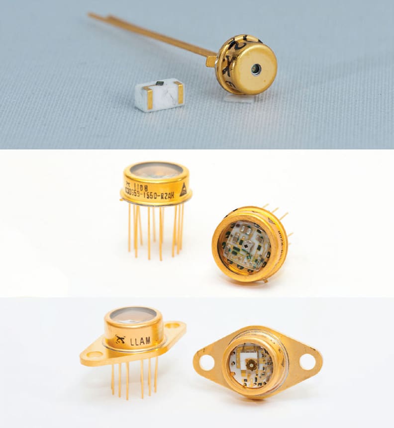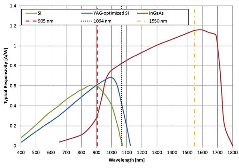 Typical Silicon APDs can easily detect 905 nm light, while some material improvements are required to increase the quantum efficiency at the YAG wavelength, 1064 nm, used mostly in military applications as laser designators for PGMs. Most LRF systems in the defense market are focused on use of eye-safe 1550 nm lasers, which are not detectable by Silicon APDs, but compatible with InGaAs APDs (Figure 2). InGaAs APDs are unable to amplify signals as much as reach-through silicon APDs, which can easily reach gains of over 100. Even with lower gain levels of 10 to 30, the lower transmission losses through the atmosphere and higher potential resolution of range are the main benefits of longer wavelength systems, while cost and much smaller detector active areas that can be offered in an economical fashion remain the main challenges for OEM suppliers.