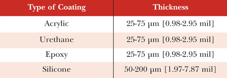 Conformal coating thickness is tested on bare, flat board surfaces or test coupons. Preferred, cured, conformal coating thickness does vary by chemistry. The IPC (Association Connecting Electronics Industries) standard deems cured films to be between 25-75 μm (0.98-2.95 mil) for acrylic, urethane, and epoxy resins. Silicones are applied roughly twice as thick. Coating thickness per chemistry as recommended by IPC-CC-830 is noted in Figure 1.