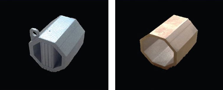 However, the new surface treatment process dissolves supports used in the AM process, removing the need to machine away or manually remove support structures, as illustrated in Figure 4. This is hugely beneficial as manually removing supports constrains the geometric freedom of the part, restricting the design possibilities of aerospace components.
