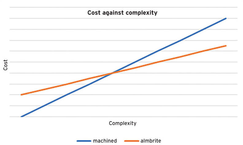 This layer manufacturing approach means that more complex parts can be produced compared with traditional processes. One of the benefits of AM for manufacturers is that increased complexity generally doesn’t have a detrimental impact on the cost of the process. Parts treated with the new technology are more cost-effective than machined parts as they can increase in geometric complexity without increasing the cost of build (Figure 2).