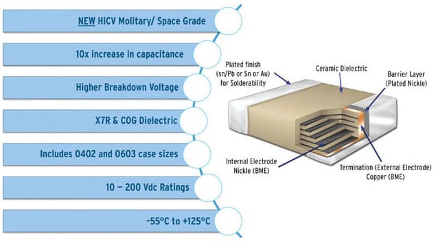 Space-grade MLCCs must perform extremely highly in terms of their volumetric efficiency and lightness, as well as reliability. Efficient and robust Base Metal Electrode (BME) technology, combined with X7R and C0G dielectrics allow high capacitance values in extremely small 0402 and 0603 case sizes.