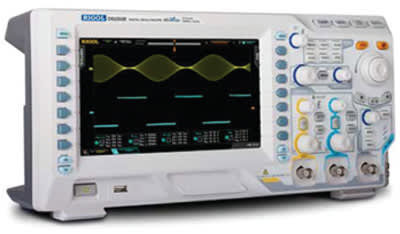 The 200 MHz DS2000E provides full 5X oversampling at 200 MHz on both channels and is supported with RIGOL’s UltraVision architecture. Other features include: large 8 inch WVGA intensity graded display, complete network connectivity, hardware waveform record/ playback, serial trigger and decode.