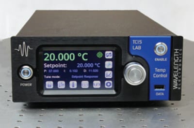 The TC15 LAB (15A, 20V) from Wavelength Electronics (Bozeman, MT) is an ultra-stable digital controller for thermoelectrics and resistive heaters where tight temperature stability is required. Stability better than 0.0009°C can be achieved at 15 Amps up to 20 Volts to a thermoelectric or resistive heater. Intuitive touchscreen front panel shows setpoint, actual temperature, stability status all on one screen. Safety features shut down your laser / QCL / active load if it goes outside user set temperature limits, while an auxiliary sensor can monitor heat sink temperature. An expanded Remote Command set allows users to control and log data from a remote computer via USB (Test & Measurement Class) or Ethernet. IntelliTune® optimizes PID control values to minimize time to temperature or reject external disturbances.
