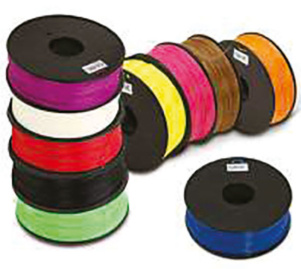 ABS is a common thermoplastic. It is less brittle (tougher) than PLA. With a glass transition temperature approximately 105 °C, it requires a higher extruder temperature than PLA — 230 °C ±15 degrees. ABS creates mild fumes when being extruded, and printers should be operated in a well-ventilated area. ABS requires a heated build plate that is heated to approximately 110 °C due to its tendency to warp when printing larger prints. Figure 2 shows example polymer filaments.