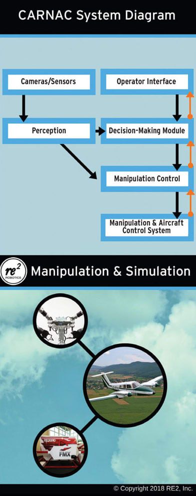 “Development of robotic applique kit pilots will enable a whole range of new missions for the military that can leverage the significant number of manned aircraft available, both civilian and military,” said CARNAC principal investigator Dr. Andrew Mor of RE2 Robotics. “These missions will cover the range from extremely long-duration missions that are not viable with a pilot in the cockpit to missions that are too dangerous to execute with a manned aircraft. And since these missions will be performed with existing aircraft, the cost/benefit ratio is improved significantly, especially in comparison to the development of a purpose-built autonomous aircraft.”