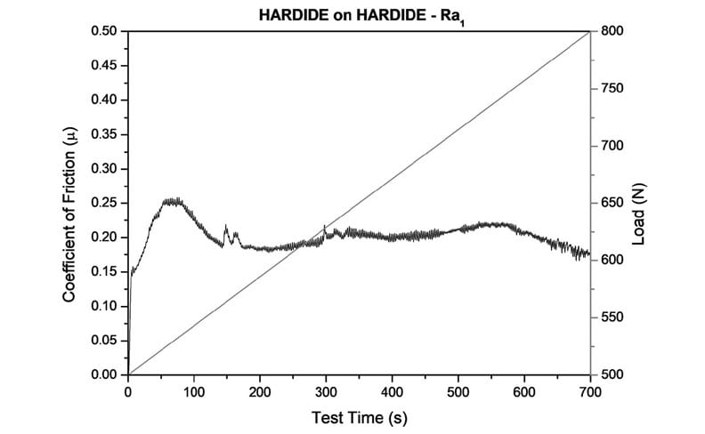 With the CVD-coated pin, the dry friction coefficient remained low, stablilizing at around 0.2. Importantly, no galling was observed even under the test rig's maximum load of 800 N, equivalent to contact pressure of 810.2 MPa. The steady state dry friction coefficient of HCP was reported at 0.70±0.1 * , more than three times higher, with spray coatings’ dry friction range stated as 0.56 to 0.61.