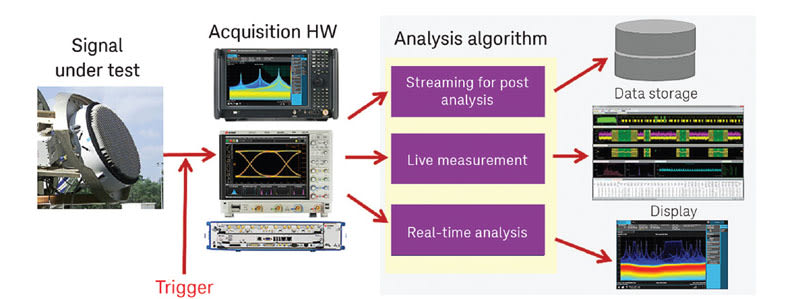 Acquisition can be as short as a single frame, or a lengthy recording that is intended for post-processing. The recording can be continuous or segmented, with some unnecessary data discarded to improve effective memory length. The bandwidth of the signal acquisition can be focused on the spectrum occupied by a single pulse or a wider signal environment or band, which includes many different ones, and may contain other signals as well. Measurement can be single-frame or post-processing with analysis that can establish triggering or some form of time alignment or reference to the measurement.