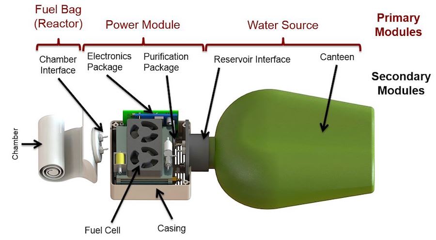 This lightweight, quiet, portable emergency power pack can be used in any field. Unlike the current lithium ion batteries used by the military, which have low energy density and pose safety concerns, this system can reduce fatigue on soldiers by safely providing them with ten times the energy stored in current lithium-ion batteries. The emergency power pack uses patented aluminum fuel that can be reacted with almost any water source, including wastewater, to generate heat and hydrogen on demand. The hydrogen is fed to a fuel cell to generate clean electricity safely and silently.