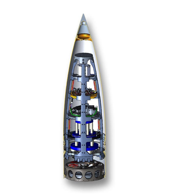An NNSA facility or a partner institution now can test its technologies with HOT SHOT and risk much less if it fails. Sandia designed HOT SHOT as a low-risk program to encourage exploration and creativity, which further augment NNSA’s ability to adapt weapons systems to urgent needs. Inside each sounding rocket, dedicated research space is divided into decks, each with its own electrical and data ports to accommodate separate, even unrelated experiments. Internal instruments monitor the experiments and prototypes and send back real-time measurements to engineers on the ground.
