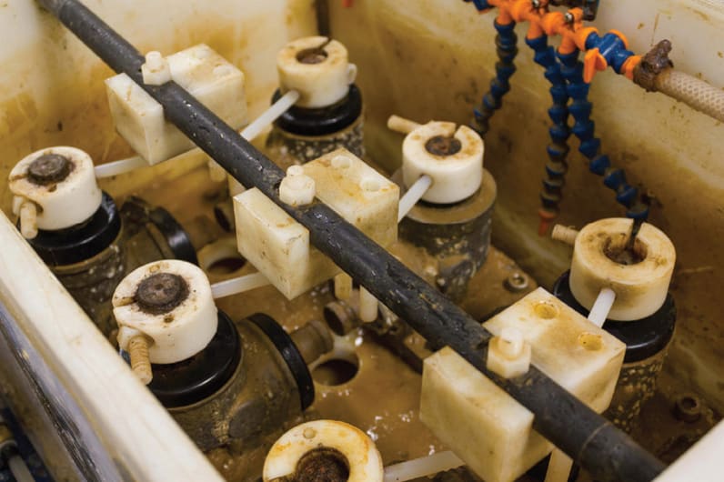 Pailton Engineering uses a salt spray test rig, where up to six steering parts at a time can be tested dynamically against salt spray, at varying temperatures. This rig is a large container with a rotary arm that controls the movement of steering components, normally at a rate of one cycle every three seconds — one cycle representing one turn of the steering wheel.