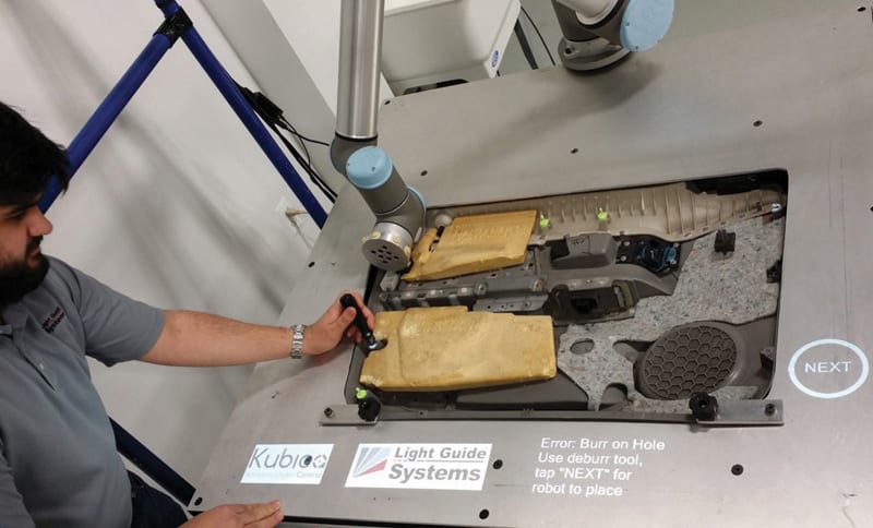 In a field like aerospace manufacturing, where uncompromising precision is so essential, integrating a projectionbased AR solution with a suite of complementary technology – including torque tools, machine vision cameras and collaborative robots – can help users achieve formerly unattainable levels of precision and consistency for even the most complex tasks. For example, the best systems are capable of fully errorproofing sequenced torque operations. Using interactive guidance, the operator receives information on next steps in real time, expediting the process by eliminating the need to refer to a separate source location for sequence information. At the same time, the system combines several sensors to independently verify that the correct torque and angle were achieved while the tool was in the correct location.