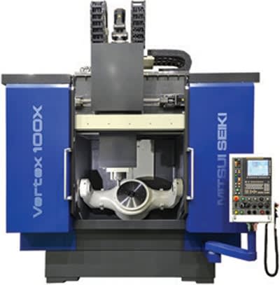 Mitsui Seiki's new Vertex 100 5-axis vertical machining center has been engineered to fulfill manufacturers’ demands for a compact, high-speed machine capable of high-precision milling of larger parts such as blisks for aircraft engines. The Vertex 100 can machine workpieces 1,250 mm in diameter and 850 mm tall while occupying only 3 m × 4.2 m of shop floor space. X-Y-Z axis strokes are 1000 mm, 900 mm, and 750 mm respectively. Maximum swing diameter is 1480 mm.