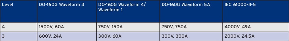 Table 2 details the open-circuit voltage (VOC) and short-circuit current (ISC) as specified in the DO-160G Section 22 lightning induced transient susceptibility standard for Waveform 3, Waveform 4/Waveform 1, and Waveform 5A for pin injection testing. The peak currents for the DO-160G Level 4 tests are much greater than standard industrial surge IEC 61000-4-5 peak currents. The waveform shape and rise/decay times for the DO-160G standard are significantly longer than those specified by the IEC 61000-4-5 standard, as shown in Figure 3.