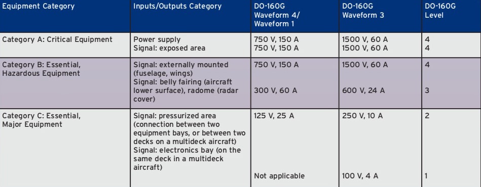 The DO-160G Section 22 lightning standard simulates the transient voltages and currents introduced into avionics as a result of the magnetic field generated by a direct lightning strike surge through the aircraft airframe (fuselage). Table 1 shows that commercial aircraft typically require DO-160G Section 22 lightning protection between Level 1 and Level 4 for Waveform 3 and Waveform 4/Wave-form 1. Aircraft equipment is divided into three zones, and each zone has an associated electromagnetic compatibility (EMC) environment. The most severe EMC environments are located in the Category A and Category B zones, which are areas of the aircraft that are not environmentally controlled. Flight control avionics are located in the Category A and Category B zones. These areas are harsh EMC environments, with DO-160G Section 22 Lightning Level 3 or Level 4 protection required.