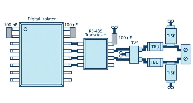 Figure 2 shows an isolated EMC protected RS-485 circuit layout example, which provides protection against industrial levels of induced lightning surge (IEC 61000-4-5 Surge). This circuit uses several discrete components, including two TISP surge protectors, two transient blocking units (TBUs), and one dual TVS. A similar circuit can be used to protect against DO-160G lightning transients. A discrete EMC protection solution presents a number of challenges for the circuit designer: