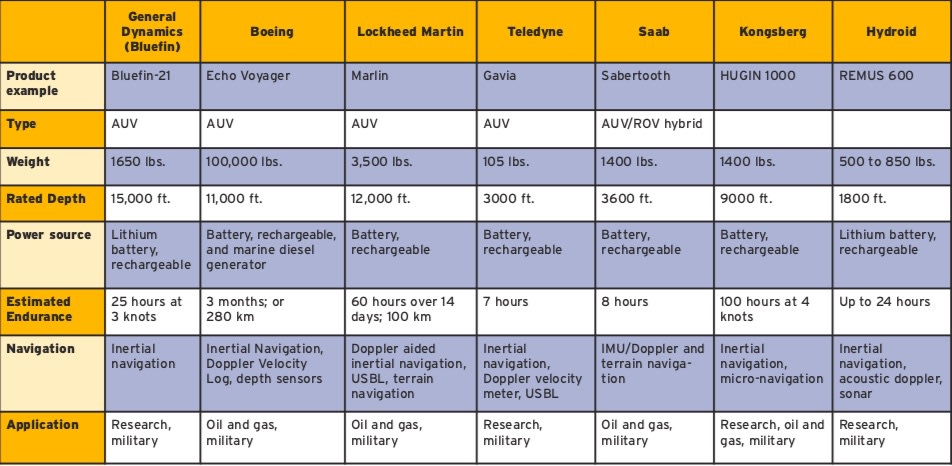 Among the major players in the AUV space (see accompanying table), several of them have especially close ties with the U.S. military.