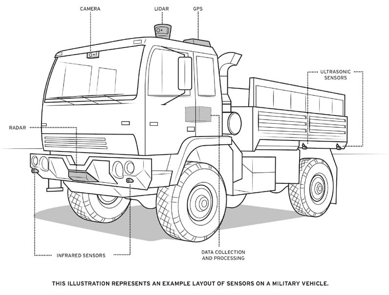 The technologies that enable autonomous driving can vary slightly, but they all require advanced vision and sensing equipment to “see” the road ahead, as well as high-powered software to make decisions based on that visual information. Most autonomous military vehicles would support some combination of the following sensors, among others: