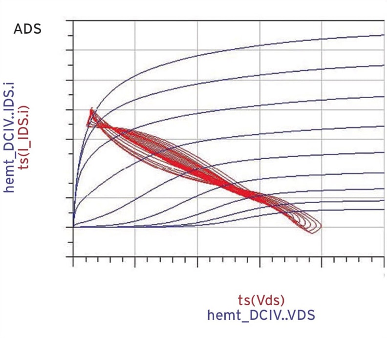 A dynamic load line simulation at the center frequency of 4.5 GHz for the one-stage power amplifier at nominal DC bias is shown in Figure 3. As an additional verification, ADS was used to repeat the small-signal S-parameter simulations but with the nonlinear HEMT model at the nominal DC bias. The gain seems a little higher than the previous simulations in MWO but the return loss and gain with frequency has a similar shape, as expected.