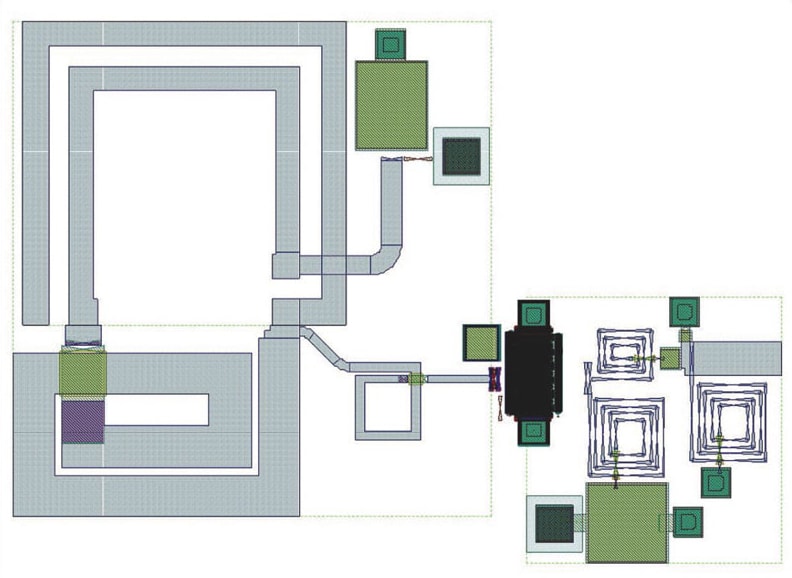 A preliminary ideal transmission line input matching circuit provided good performance from 2 to 7 GHz. The ideal input matching elements were replaced with MMIC components resulting in two relatively large inductors. Next, the folded, spiral, coupled line required electromagnetic (EM) simulation to verify its performance. A pseudo layout of the full one-stage, 1.2-mm, 2- to 8-GHz power amplifier is shown in Figure 2; note the large area required for the broadband input match.