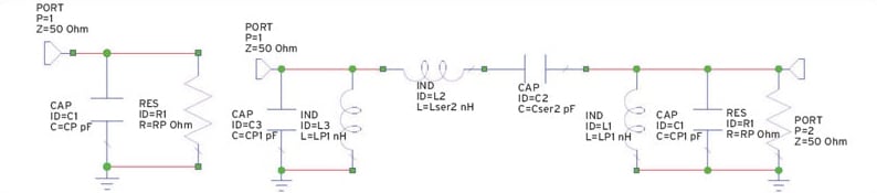 The preliminary design of a single, high-electron mobility transistor (HEMT) and 2-way parallel combined HEMT power amplifier was performed. These initial broadband power amplifiers are based on a 12 × 100μm HEMT at a nominal recommended DC bias. This size HEMT had an optimal match provided by Raytheon as “RLoad” ohms in parallel with a negative “CDS” pF in capacitance. Since a negative reactance can only be matched over a limited band, an initial design was performed of an ideal, double, tuned, Q bandpass match for broadband operation centered around 4.5 GHz, with a goal of achieving 2 to 10 GHz. A schematic of the ideal load as a resistor in parallel with a capacitor and the ideal, double, tuned output matching circuit is shown in Figure 1.