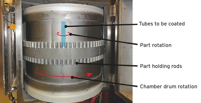 The circular symmetry of the tubes that DSI coats for countermeasure applications provided an opportunity for the company to engineer customized tooling for the MicroDyn® sputtering system that would enable production of a uniform coating around the entire circumference of the cylinder in a single coating run. In this case, each individual tube is mounted on a rod within the coating chamber, and this tooling is configured so that the rods rotate throughout the coating process in a way that is synchronized with both chamber motion and the sputtering deposition process. The result of this motion is that every area on the outer surface of the tube is exposed to the coating material source for the same amount of time, producing uniform layer deposition around the entire tube circumference.
