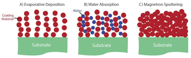 Sputtering is a coating process which increases the energy with which molecules impact the substrate surface. Consequently, the various forms of sputtering result in coatings that are substantially more densified than is possible using evaporation. This makes sputtered coatings essentially impervious to water absorption and its attendant performance shifts.