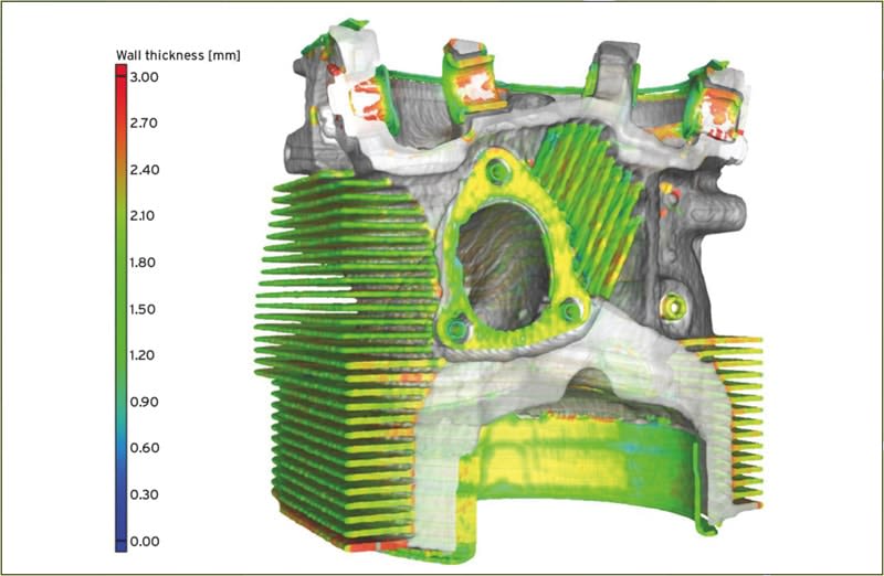 These are just some of the many ways that CT-scanning plus software analysis are increasingly being employed by the aerospace industry, including commercial, defense, and NASA, to ensure product integrity and meet certification requirements. Other applications of the methodology include engine wall-thickness evaluation (Figure 4), injection-molded part geometry correction, soldering inspection of circuit boards, evaluation of hot-formed aircraft parts, reverse engineering of older aircraft, crash forensics, and more.