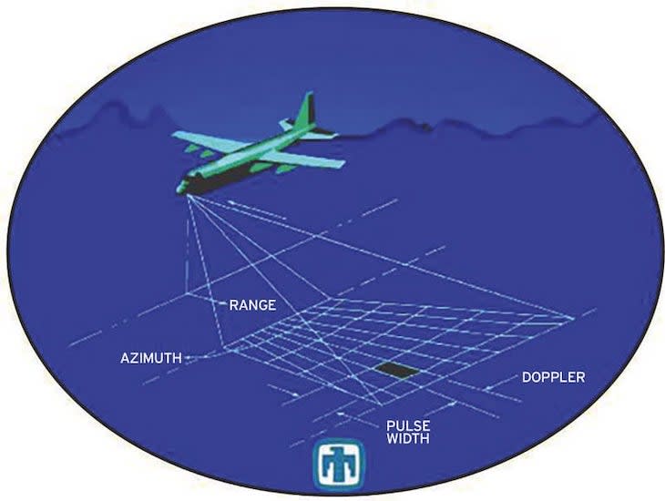 Consider an airborne SAR imaging perpendicular to the aircraft velocity as shown in Figure 1. Typically, SAR produces a two-dimensional (2D) image. One dimension in the image is called range (or cross track) and is a measure of the line-of-sight distance from the radar to the target. Range measurement and resolution are achieved in SAR in the same manner as most other radars. Range is determined by measuring the time from transmission of a pulse to receiving the echo from a target and, in the simplest SAR, range resolution is determined by the transmitted pulse width, i.e. narrow pulses yield fine range resolution.