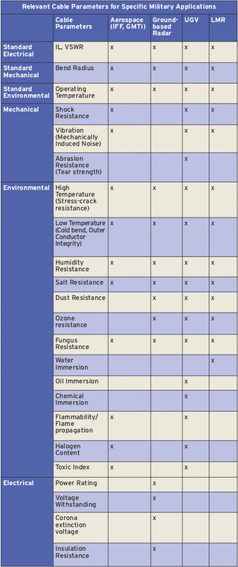 Ground-based military applications such as Land Mobile Radios (LMR), Unmanned Ground Vehicles (UGV) and ground-based radar (e.g.: phased array radar) experience both high and low temperature extremes as well as humid conditions. Mechanical vibration and shock can be induced in mobile vehicles and train transports. Enclosed spaces will require that any toxic fumes released by the cabling be minimal. And a similar type of fluid contamination can occur with UGVs causing the need for robust jacketing material. Land vehicles may also require a level of crush and abrasion resistance to prevent the coax from breaking during vehicle run over. This can be accomplished through the use of armored cables or a suitable elastomer jacket.