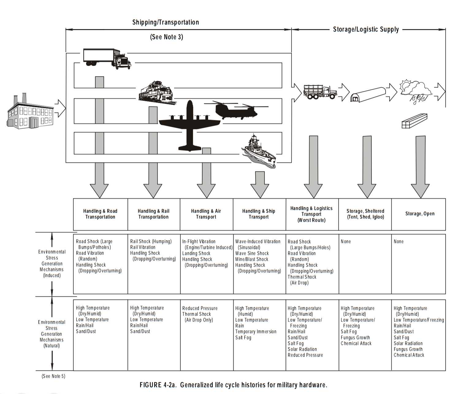 While the performing frequency band of a coax generally changes its dimensions, the environment has a significant impact upon the materials used in its construction. Some natural and induced environmental factors are shown in Figure 2, an image taken from the MIL-STD-810 standard for environmental engineering considerations of various military systems. It can be readily seen that factors such as cable size, weight, power handling, and ability to withstand certain hazardous conditions become paramount to the functionality of an entire system. The choice of materials for the dielectric, inner and outer conductors, and jacketing material can then become serious considerations.