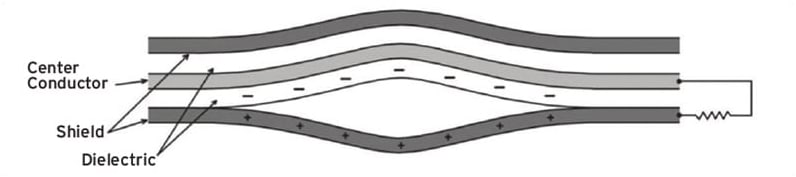 There is also a mechanically induced signal generation that occurs during vibration between the shield and dielectric material as shown in Figure 3. This tribo-electric induced noise can cause additive noise on sensors for in-flight testing or other highly sensitive equipment. It is important that this noise stay below a certain threshold for the proper performance of these systems.