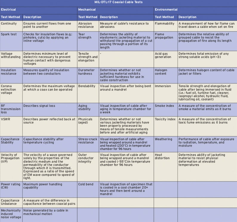 It is therefore critical to ensure that a cable assembly can tolerate the various electrical, mechanical, and environmental conditions that it may be exposed to. This involves a rigorous process of standard electrical tests, burn-in and additional relevant testing before being deemed as field deployable. RF interconnect such as coaxial cables have several primary standards that help to ensure cable performance regardless of environmental factors; these standards include MIL-DTL-17, MIL-PRF-39012, and MIL-STD-348. A more thorough listing of standards can be seen in Table 1.