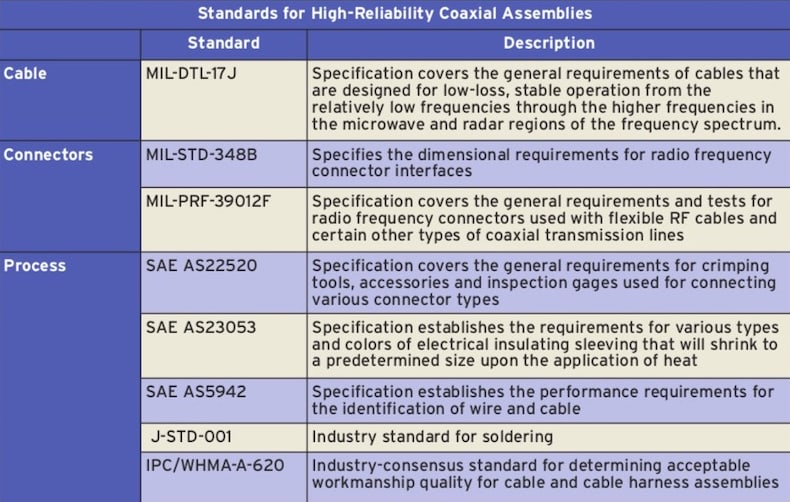 The combination of standards such as these allow for reliable integration of interconnect in most military systems and mitigating the risk of failure. The MIL-DTL-17 and MIL-PRF-39012 general specifications for cables and connectors provide an outline for coax construction and testing while the J-STD and SAE standards list assembly related standards.
