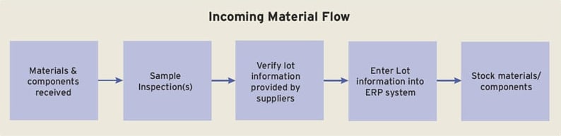 Lot traceability is another important requirement for any components deployed in the military. Lot traceability can be defined as the ability for a vendor to track the materials used in a product back to their respective sources. This type of tracking must be implemented from the receiving stage to the shipping stage, and all other stages in between. Likewise, data capture of the relevant lot information is important and often best accomplished with regimented uploads to an ERP system. Figure 1 shows a sample flowchart of incoming material flow process. The assembly and test processing flow for a coaxial cable brings many more steps in this process where logging connector/soldering/heat shrink installation and verification are key for every step in cable construction.