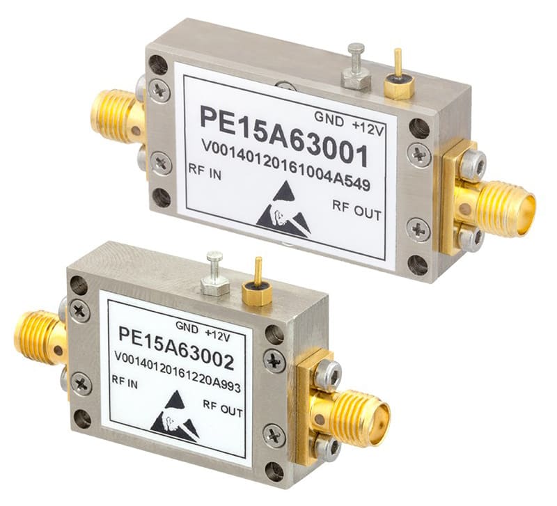 Pasternack (Irvine, CA) has released a new line of input-protected low-noise amplifiers (LNA's) with no damage up to +30 dBm CW input power that are ideal for radar systems, EW applications, military/microwave radios, wireless and satellite communications and test instrumentation. The new line consists of 12 different models that cover a broad range of frequency bands from 10 MHz to 3.5 GHz. These designs exhibit typical performance that includes low noise figure levels from 0.8 to 1.6 dB, high-small signal gain ranging from 25 to 40 dB, and low VSWR levels from 1.3:1 to 1.5:1. This performance is achieved through the use of hybrid MIC designs that incorporate PIN diode limiter circuitry and Enhancement mode (Emode) GaAs pHEMT semiconductor devices. These amplifiers operate with a bias voltage of +12V typical over the temperature range of -40°C to +85°C. The 50 Ohm, SMA connectorized modules are unconditionally stable, include built-in voltage regulation and have DC blocking capacitors on the RF ports.